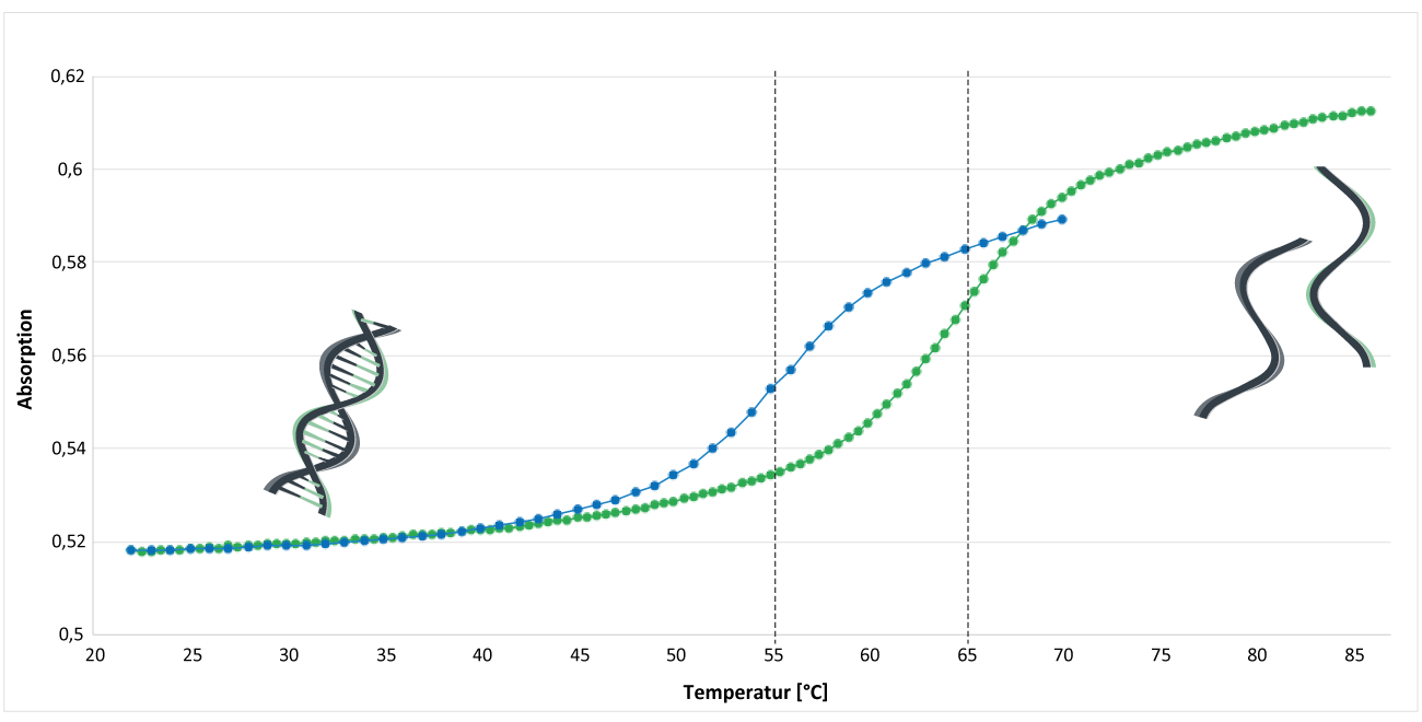 Im direkten Vergleich der beiden Oligonucleotide kann unter den hier gewählten Bedingungen ein Anstieg der Schmelztemperatur um ca. 10°C festgestellt werden.