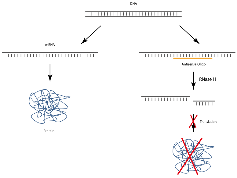The complex of antisense DNA oligonucleotide and the bound RNA strand is recognised by RNase H, which enzymatically cleaves the RNA. As a result, the antisense DNA oligonucleotide is released and thus again available for binding complementary RNA.